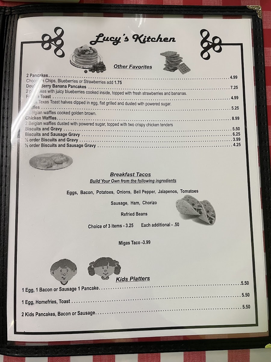 Welcome to Lucy's Kitchen, a gem nestled in Elgin, Texas, offering a delightful fusion of Southern comfort and Tex Mex cuisine. Their menu showcases breakfast staples that are not only affordable but incredibly satisfying. Start your day with a Migas Taco for just $2.50 or choose the flavorful Fajita Taco for $2.75, served with an array of delectable sides like a fluffy pancake for $1.50 or a perfectly cooked egg for only $0.99.